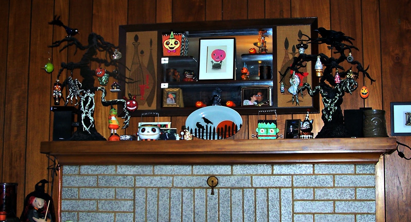 The biggest part of our Halloween decorating is our mantle. I used some of our old pictures and covered the faces with pumpkins and gave OMP some google eyes.