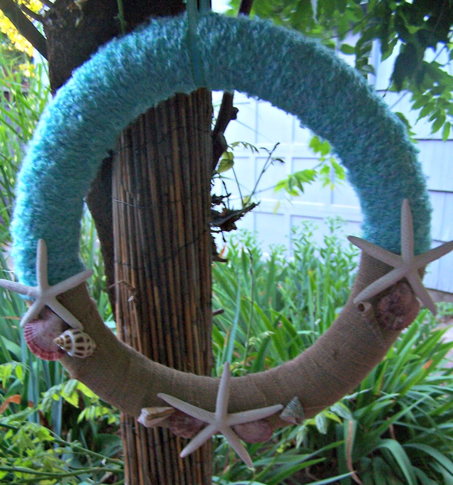 For the ocean (or the sky) I used chunky blue yarn and for the sand I used burlap. I added some shells and there ya have it, a beach wreath.