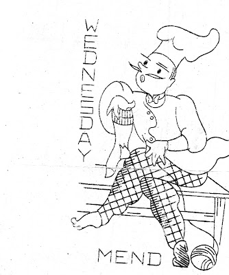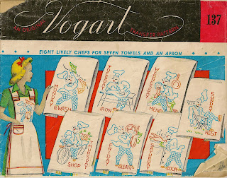 I can't believe that I haven't posted these cute little chefs before. My favorite, of course, is the chef sewing his sock. I also like that these are kind of manly and would be great on a dude apron. Hee hee!
